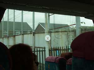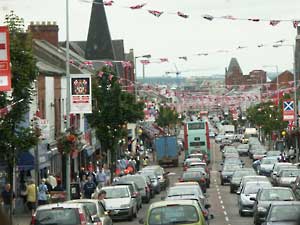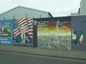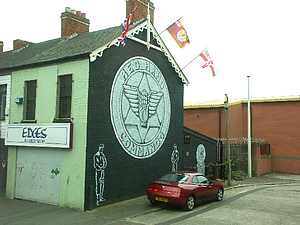 Auffällig auch die bemalten Häuser mit politischen und kriegerischen Szenen und Parolen. Heute ist das nicht mehr so krass, aber in den Siebzigern war es ganz schlimm: wenn da eine Morddrohung an einem Giebel gegen einen Kommunalpolitiker auftauchte - der war 14 Tage später garantiert tot. Heute haben die Wandgemälde auch zunehmend internationale Themen zum Inhalt. |