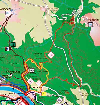 | Wir wollen zum Hockstein und folgen in Rathen der roten Markierung TK9 (später grüner Strich auf weißem Grund) | |