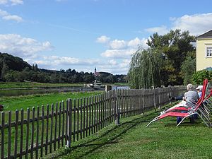 Es war kurz vor Mittag, einige Gäste bekamen schon ihr Essen. Riesige Portionen! Das Jägerheim war schon früher bekannt für gutes Essen. Für uns war es aber noch zu zeitig und auf dem alten Schulweg liefen wir hinunter nach Diesbar. Unten an der Elbe fanden wir eine schöne Bank in der warmen Sonne und so gab es eben eine Rucksackmahlzeit. |