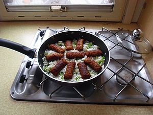 Mit Feta gefüllte Hackfleischröllchen an mit gedünsteten Paprika angereicherten Reisrand. |