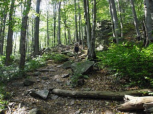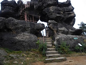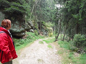 Wir stiegen aber schon eine Station vor Oybin aus. Unsere Wanderroute soll uns über den Töpfer und den Scharfenstein dann nach Oybin führen. Gleich an der Teufelsmühle führt der Weg steil, ziemlich steil, nach oben. Zweimal sehen wir abzweigende Wegweiser mit dem Ziel Töpfer. Doch immer mit dem Hinweis: (beschw.). Sinnigerweise heißen die Wege auch Stiege und Krieche. Wir verzichteten auf die Abzweigungen und gingen den Hauptweg, der einem aber auch ganz schön aus der Puste brachte. Schließlich gab es ca. 200m Höhenunterschied zu bewältigen.