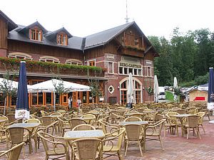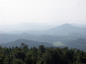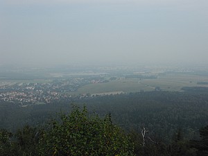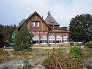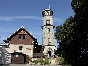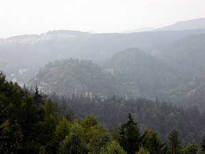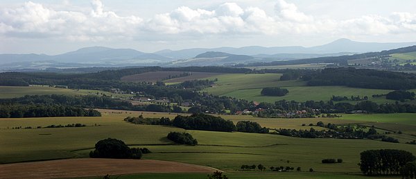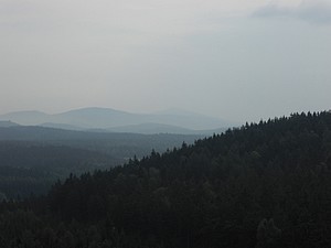 Wir mussten den Kopf ordentlich in den Nacken legen, um den Weglauf zu verfolgen. Mann ging das steil nach oben. Also los! Nach kurzer Zeit wanderte die Weste in den Rucksack. Später wurden die Ärmel hochgekrempelt. Wir schweißten. Der Schweiß rann nur so. Die übliche Kaffeepinkelei fiel aus. Das Wasser kam oberhalb der Gürtellinie, bei mir besonders auf dem Kopf, heraus. Über den weiteren Weg kann man frei nach Arthur Schramm sagen: „Der Weg ist steil, oben wird er steiler!“ Durstig kamen wir an der Hochwald-Turmbaude an. Geöffnet! Das Radler mundete. Wir haben hier ein schönes sonniges Plätzchen auf der Terrasse gefunden, Mittagszeit war auch und so ließen wir uns eine hervorragende Knoblauchsuppe und Böhmisches Bierfleisch mit Knödeln schmecken. Dann ging es auf den Turm. Und das war dort oben umwerfend. Was für eine Aussicht! Freie Sicht in alle Himmelsrichtungen. Keilberg und Zwickau sind zu sehen, allerdings nur bei besten Sichtverhältnissen. Und die Berge in Böhmen und bis zum Riesengebirge kann man schauen. Sogar die Schneekoppe ist zu sehen. Laufend entdeckten wir etwas Neues. Wie muss das erst hier oben sein, wenn wirklich gute Fernsicht ist. |