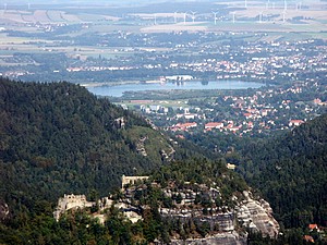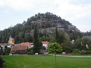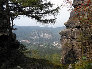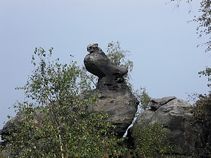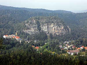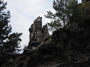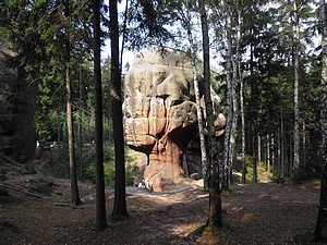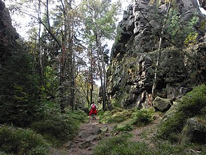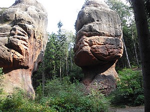 Wir wählten den Abstieg übers Kammloch. Hier stösst der Wanderweg auf die Wege ins Böhmische. Kurz geht es die Strasse mit 17% Steigung hinab, dann erreicht man die Kelchsteine. Felsen aus Buntsandstein, rot gefärbt. Sie stehen wirklich auf einem dünnen Fuß, das ganze gleicht einem Kelch. Der weitere Weg in den Ort führt an verschiedenen, beeindruckenden Felsformationen vorbei. Viele davon sind bekannte Kletterfelsen.