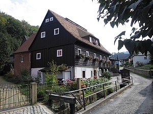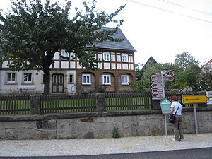 Nach 12 Uhr fahren wir nun über Großschönau nach Waltersdorf. Ulla war diesmal mein Navi. Großschönau haben wir gut erreicht. Bei Aldi tankten wir unsere Vorräte auf und beim benachbarten Fleischer wollten wir noch etwas frische Wurst holen. Hier gab es aber auch einen Imbiß und als Tagesgericht heute „Teichelmauke“. Null Ahnung was das sein sollte. Die Verkäuferin versicherte, dass das typisch für die Oberlausitz ist. Wieder mit viel „R“ erklärte sie uns: Kartoffelbrrrei, rrringsum Sauerrrkrrraut, darauf Möhrrren und Bohnen, darauf Rrrindfleisch und das Ganze mit Brrrühe überrrgossen. Wir waren neugierig und bestellten zwei Portionen. Sie freute sich über unseren Mut und verschwand in der Küche. Was sie brachte sah gar nicht schlecht aus – und es schmeckte! Das war die Oberlausitz. „Teichelmauke“. Wir kauften noch ein kleines Blutwürstel und Leberwürstel. Dann ging es weiter. Wir wollten nach Waltersdorf. Hier versagte mein Navi „Ulla“ und schickte mich in die entgegen gesetzte Richtung. Zaghaft die Ansage nach 2 km: „Hier sind wir aber nicht richtig“ Keine andere Lösung, keine Neuberechnung, nur: „Jetzt gib doch in deine Suse Waltersdorf ein“. (Unser Navi, d.h. die freundliche Stimme nennen wir Suse und unser WOMO heißt Willi). Und unsere Suse führte uns jetzt zuverlässig nach Waltersorf. Allerdings war dort die Hauptstrasse gesperrt. Ein Schild aber: Bis zum Quirlehäusel frei. Wir sind zwar keine Freunde der „volkstümlichen Musik“ aber aus einigen Wanderfilmen ist es uns bekannt. Also fuhren wir mit WOMO dorthin. Dort war dann aber auch wirklich Schluss. Keine Wendemöglichkeit! Die haben ja dort nicht mal Parkplätze! Alles voll gestellt mit Baufahrzeugen. Wir haben es aber doch geschafft hier zu wenden. Und das ohne Servolenkung! Hinter der Kirche haben wir dann einen Parkplatz gefunden, kostenlos, ruhig gelegen, hier kann man auch über Nacht stehen. Nun spazierten wir durch den Ort, diesmal zu Fuß am Quirlehäusel vorbei. So richtig hat uns das Häusel aber nicht vom Hocker gerissen. Nur die vielen Umgebindehäuser sind sehr schön und auch liebevoll erhalten.