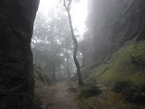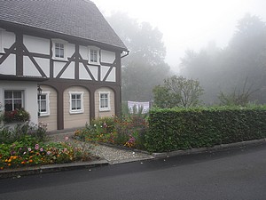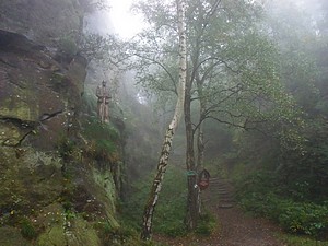 Durch Jonsdorf ging es vorbei an schönen Umgebindehäusern und dem Gemeindeamt bis zum Aufstieg zum Sportplatz. Wir schnauften schon etwas, da kam von hinten ein Auto (Kennzeichen KU) den schmalen Weg hoch. Die Scheibe wurde runtergekurbelt und der Fahrer fragte und nach dem Weg zum Schaubergwerk. Seine Beifahrerin hatte einen Autoatlas mit dem gröbsten Maßstab, den man sich denken kann, aufgeschlagen. Wir kannten uns aber auch nicht so aus, wussten aber, dass man dort nur zu Fuß hinkommt. Da fuhren sie eben rückwärts wieder den steilen Berg hinunter, wenden konnte man nicht. War auch gut so, nach dem Sportplatz ging der Weg dann nur über Treppen, Felsstufen und durch enge Felsspalten weiter. Der Nebel blieb so dicht, manchmal war es in den Felsschluchten richtig gespenstig. Von den Aussichten hatten wir aber gar nichts. Es war eben eine Wanderung der anderen Art. Die Bilder sprechen davon.