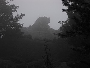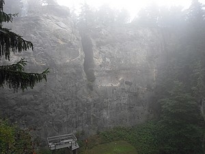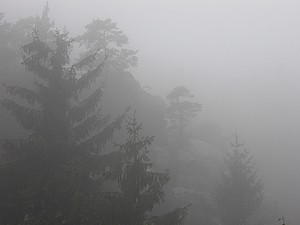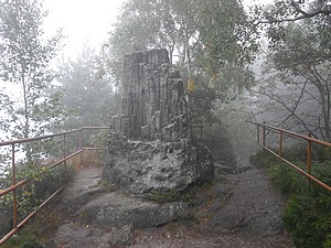 Der Lauscheblick verschwand im Nebel. Der Steinbruch Schwarzes Loch war trotzdem überwältigend. Nach dem Passieren der Steinbrüche ging es weiter durch die Jonsdorfer Felsenstadt. Die Erosion hat hier phantasievolle Felsgebilde geschaffen. Die Jonsdorfer Orgel ist ein in Europa einmaliges Sandsteingebilde. Sieht aus wie Basaltsäulen, ist aber aus Sandstein.