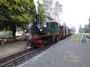 Dienstag, 15. September 7:30 Uhr klingelte unser Wecker. Wir haben viel vor. Als erstes frische Brötchen holen. Frühstücken. Dann Wandersachen anziehen. Fahrräder abbauen. Per Fahrrad zum Bahnhof fahren. Natürlich verfahren. Aber pünktlich 9:19 Uhr auf dem Bahnsteig der Zittauer Schmalspurbahn gewesen. Diese hatte auch ein wenig Verspätung. 11 € pro Person kostet die Hin- und Rückfahrt nach Oybin. Es ist aber auch ein tolles Erlebnis.