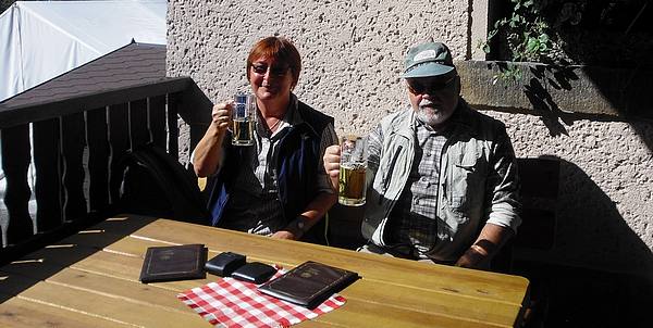Und dann gab es ein weiteres Highlight unserer Wanderung: Kuchen, Kaffee und ein großes Bier. Bis zur Abfahrt des Zuges schauten wir uns noch den schönen Kurort an. Vielleicht fahren wir morgen noch mal dorthin, wir haben auch einen Parkplatz als Stellplatz entdeckt.