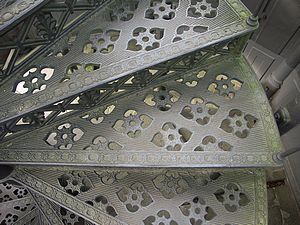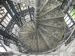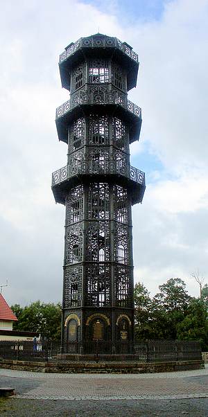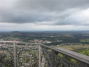 Von dort geht es dann noch steiler den Weg zum Aussichtsturm hinauf, immer entlang der Rodelbahn. Und dann erreichten wir das Plateau mit dem Turm. Ein gusseiserner Turm. 1854 erbaut, 1993/94 demontiert, restauriert und wieder errichtet. Für 1 € darf man 119 Stufen hinaufsteigen in diesem gusseisernen Bauwerk. Ein Aufstieg ist pure Nostalgie. Und oben bietet sich ein 360° Rundumblick. |